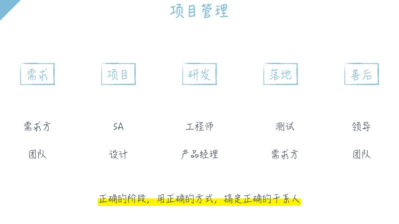 总结来看:首先,我们要掌握项目管理的核心,就是任务化/时点化。然后,请抓住每一个关键节点,倘若你在不恰当的节点找了错的人,就会打扰人家的工作效率,甚至耽误项目整体进度。所以每一个关键节点,抓住一两个关键的人足矣。最后,项目推进的载体我推荐是电话会议和报表邮件,这两个载体可以称为项目管理的警钟:进度汇报,通常周或版本周期通报进度,月度再多通报全局情况和预期状况。